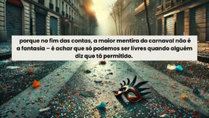 porque o carnaval é fuga, mas também é revelação. a gente passa dias vivendo sem freio, sem regras, sem medo de errar. e aí, de repente, precisa voltar a encaixar no formato esperado. só que depois de tanta cor, de tanta liberdade, a rotina parece ainda mais cinza. por que é tão difícil ser um pouco mais livre o resto do ano? por que a gente só se autoriza a viver de verdade quando tem feriado pra justificar?