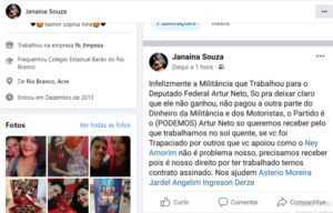 No post dela, Janaina afirma que “ infelizmente a militância que trabalhou para o deputado federal Artur Neto, só para deixar claro que ele não ganhou, não pagou a outra parte do dinheiro da militância e dos motoristas, o partido é o Podemos”, diz a jovem na publicação.