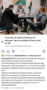 Em visita ao gabinete do senador Sérgio Petecão, em Brasília, Marcio Pereira afirma que foi até o senador “apresentar nossos projetos para os próximos anos”. Em outra publicação do secretário, desta vez no escritório de representação do Acre em Brasília, Marcio Pereira afirma que “ a próxima gestão do governador Gladson Cameli terá excelentes projetos para execução” .