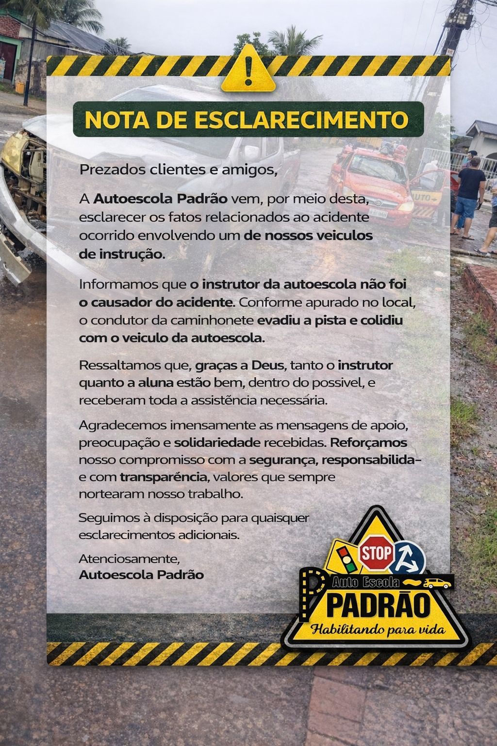 A colisão ocorreu quando a Hilux atingiu a lateral do veículo de instrução, arremessando-o contra um poste de energia elétrica. O impacto foi tão severo que resultou na perda total do carro da autoescola. Uma passageira que estava no automóvel atingido sofreu ferimentos graves, incluindo um corte profundo na cabeça, sendo socorrida pelo Corpo de Bombeiros e encaminhada ao Hospital Regional Wildy Viana.