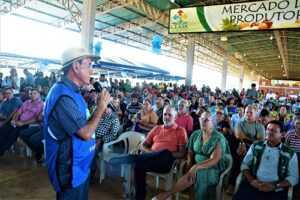 O prefeito Tião Bocalom reuniu produtores na Central de Abastecimento de Rio Branco (Ceasa), nesta segunda-feira (26) para entregar 150 barracas para feirantes, 480 kits hortas e fez o lançamento do crédito Fomento Mulher, que visa ajudar as mulheres, titulares de lotes, a implantar projetos produtivos e incrementar a renda familiar. O valor é de R$ 5 mil, para saque em operação única.