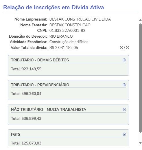 A construtora DESTAK CONSTRUCAO CIVIL LTDA, responsável pela construção da Rampa de Acesso ao Rio Iaco, teve seu nome exposto na lista de devedores da Procuradoria-Geral da Fazenda Nacional (PGFN). Segundo informações disponíveis no portal da PGFN, a empresa acumula uma dívida total de mais de R$ 2 milhões, distribuídos entre débitos tributários, previdenciários, multas trabalhistas e FGTS.