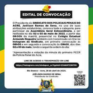 O Presidente do SINDICATO DOS AGENTES PENITENCIÁRIOS DO ACRE, Joélison Ramos de Sena, no uso de suas atribuições estatutárias (Art. 28 do Estatuto Social), convoca toda a categoria dos Policiais Penais do Acre, para participar da Assembleia Geral Extraordinária, a ser realizada no dia 02 e 03 de maio de 2023 (terça/quarta-feira), a partir das 08:00h da manhã, presencial no Colégio Estadual Armando Nogueira, e também com transmissão on-line no Instagram oficial do Sindicato, através de vídeo conferência na rede social pelo endereço eletrônico (link de acesso https://instagram.com/sindapen_ac?igshid=ZDdkNTZiNTM=), a instalar-se em primeira convocação às 08h00 e, em segunda e última convocação às 09h00, dos dias 02 e 03 de maio, tendo a seguinte ordem do dia: